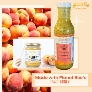 Ingredients: Peach jam (contains grape juice), canola oil, Planet Bee wildflower honey & peach honey, apple cider vinegar, water, mustard, poppyseeds, salt, turmeric, pepper, ginger.